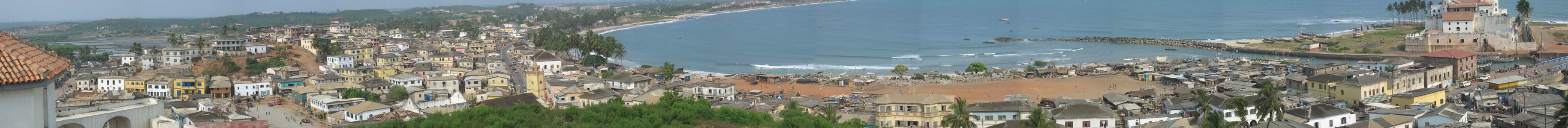 You will have to scroll to the right to see the whole photo. Half of Elmina can be seen on the left half of the photo. The Ocean is in the middle.